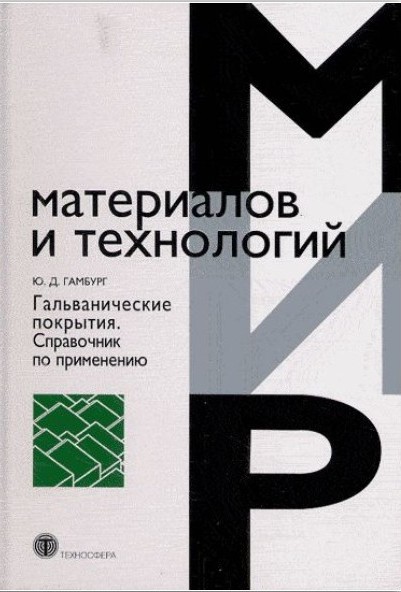 Гамбург, Юлий Давидович. Гальванические покрытия: технологии, характеристики, применения: [справочник] / Гамбург Ю.Д. — 2-е изд., перераб. и доп. — Долгопрудный: Интеллект, 2018. — 230, [1] с.: ил., табл. — ISBN 978-5-91559-235-2