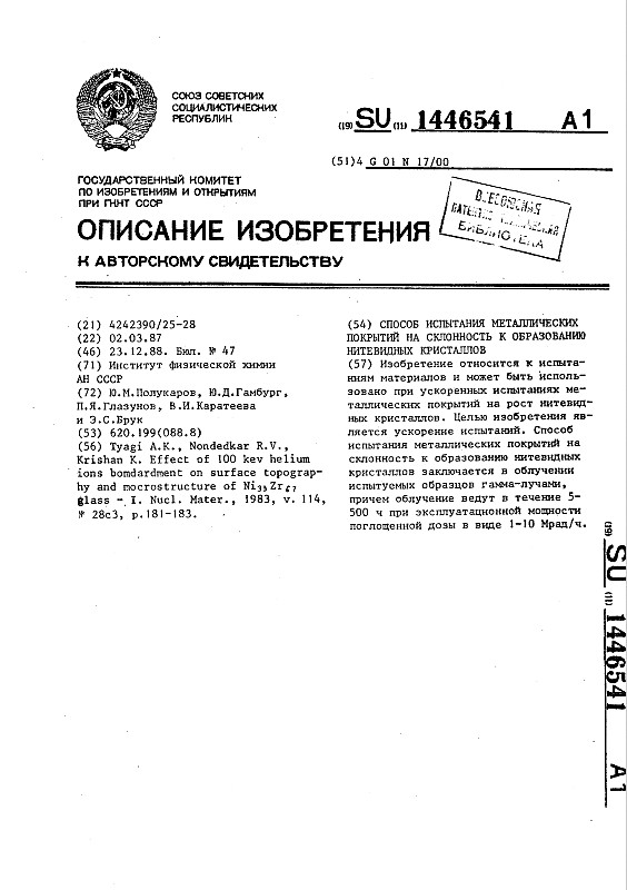 Способ испытания металлических покрытий на склонность к образованию нитевидных кристаллов. Полукаров Ю.М., Гамбург Ю.Д., Глазунов П.Я., Каратеева В.И., Брук Э.С. Авторское свидетельство SU 1446541 A1, 23.12.1988. Заявка № 4242390 от 02.03.1987