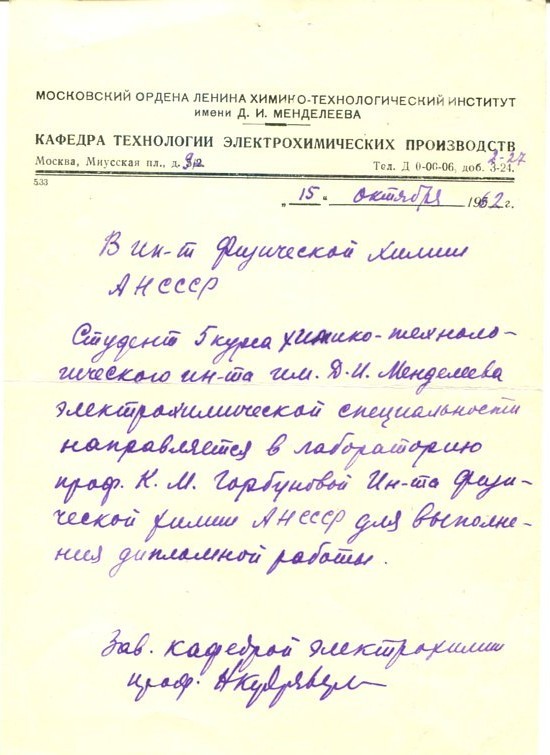 Началом своей научной деятельности юбиляр считает апрель 1961 года, когда на студенческой конференции МХТИ сделал доклад о получении блестящих медных гальванопокрытий при наложении переменного тока на постоянный. Эта работа была начата еще в 1959 году и выполнена под руководством аспиранта Р.Ю. Бека (который впоследствии стал известным специалистом и возглавлял электрохимическую лабораторию в Новосибирске).