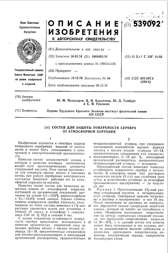 Состав для защиты поверхности серебра от атмосферной коррозии. Полукаров Ю.М., Каратаева В.И., Гамбург Ю.Д., Грилихес С.Я. Авторское свидетельство SU 539092 A1, 15.12.1976. Заявка № 1989495 от 30.01.1974.